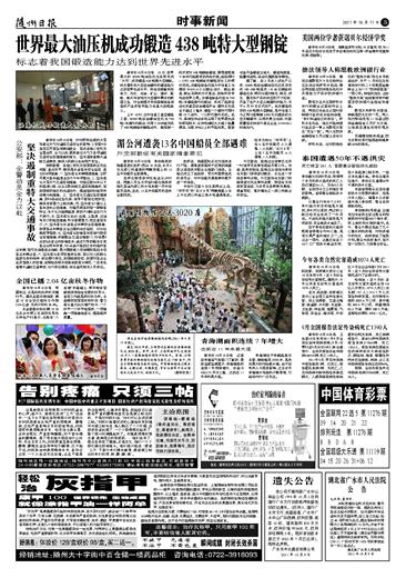 图为:油压机成功锻造大型钢锭 新华社10月10日电 10日,世界最大的18500吨油压机在洛阳完成“大考”,成功锻造438吨特大型钢锭。标志着我国大型自由锻件的锻造能力达到世界