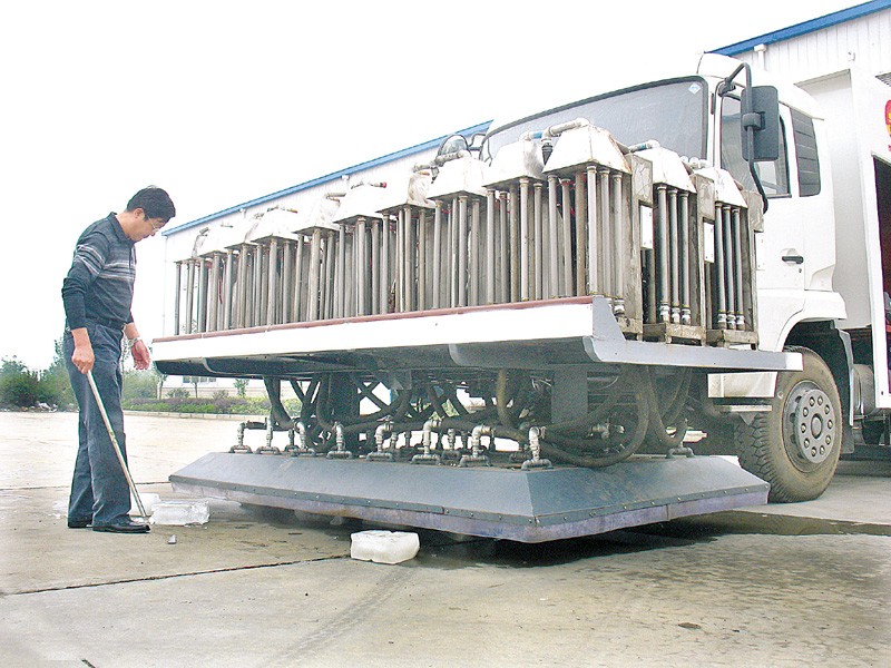 10月10日,记者在随州市东正专用汽车有限公司采访时看到,由公司总经理杨仁才发明的除冰车正在进行最后调试。七八块10厘米厚的冰块放在除冰车前面的除冰装置下,不到5分钟冰块便全部被溶化为水。东正研发的除冰车由电能转化为热能,集融冰、吸水、烘干于一体,1小时的除冰成本仅为1000元,很有市场竞争力,有望批量生产。 (本报记者 杨闻名 摄)