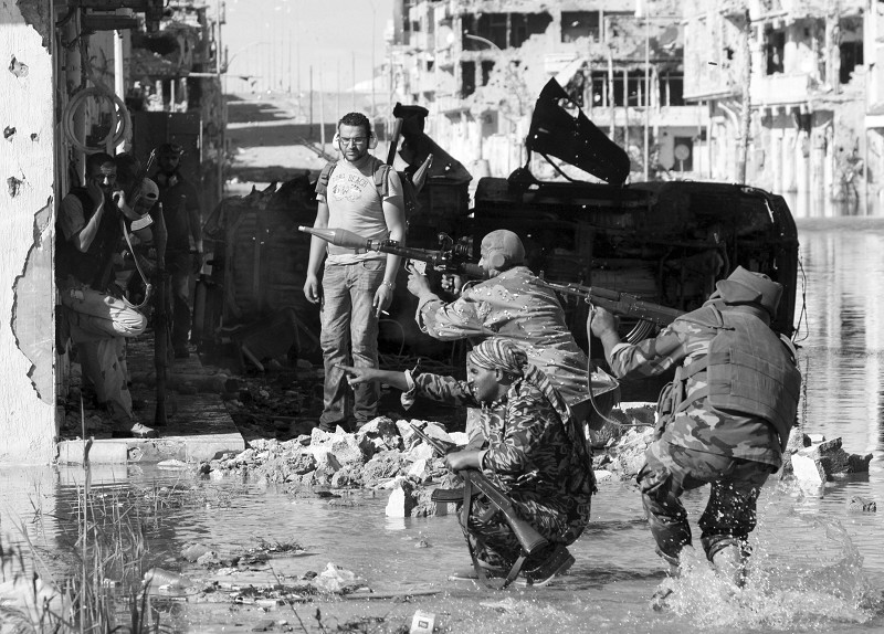 10月14日,在利比亚苏尔特,利比亚执政当局武装人员与卡扎菲残余势力交火。当日,利比亚执政当局武装和卡扎菲残余势力继续在苏尔特城内战斗,执政当局否认了卡扎菲之子穆塔西姆在苏尔特被捕的传闻。执政当局军队一名指挥官说:“苏尔特东部的战事已经全部结束,我们正向战斗仍在继续的西部增派兵力。” (新华社发)