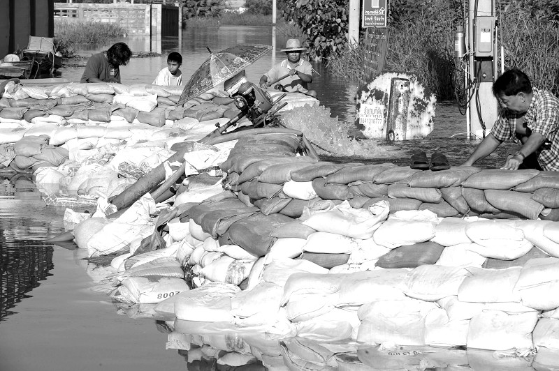 10月15日,泰国巴吞他尼府青拉亚县班普劳的村民用抽水机抽积水。 (新华社发)