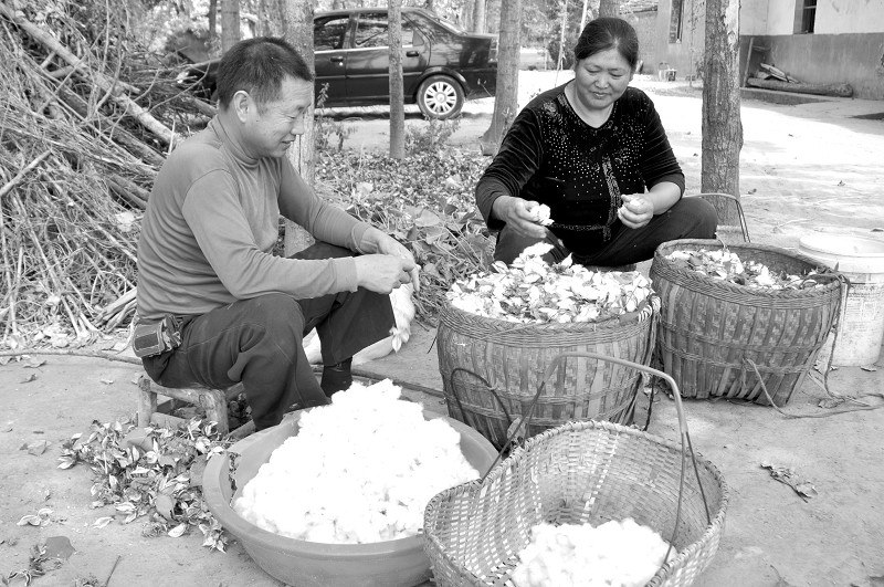 随县厉山镇双星村二组陈道林夫妇。今年种植了七亩水稻,亩产达900公斤,创下高产记录。棉花产量高,花朵大,白如雪,在该村传为佳话。图为陈道林夫妇正在摘选棉花。 (本报记者 陈德友 摄)
