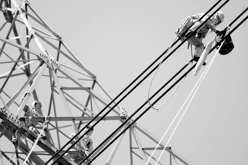 10月17日,工作人员在对±660kV电压等级输电线路实施带电维修。当日,山东省德州平原县王庙镇楼庄村头,电力作业人员登上56米高的高压铁塔,完成了±660千伏电压等级带电作业。据介绍,这是世界上首次在±660千伏高压线路上进行高空带电作业。 (新华社发)