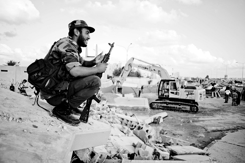 10月16日,在利比亚首都的黎波里,一名当局武装人员坐在被拆毁的阿齐齐亚兵营外墙的残骸上。利比亚当局的一些武装人员当日集结到的黎波里市的阿齐齐亚兵营,开始拆除兵营的围墙和卡扎菲在兵营里的住所。 (新华社发)