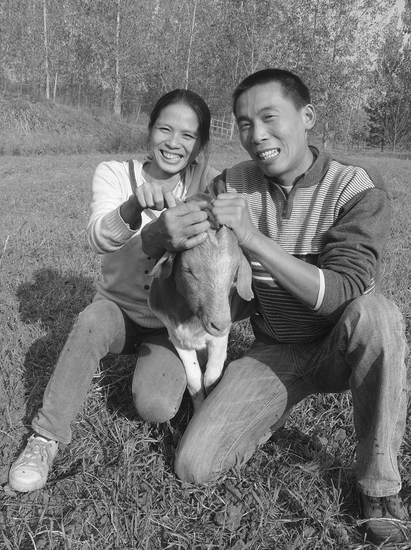 十月十七日,大洪山风景名胜区喻家湾村,市老促会重点帮扶户程行军和妻子抱着羊笑着说:“种麦喂羊,既解决冬季青饲料难题,还使羊上膘快、增重快,更能卖出好价钱。”(石守京 摄)