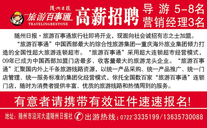 ·随州日报旅游百事通旅行社招聘导游营销经理