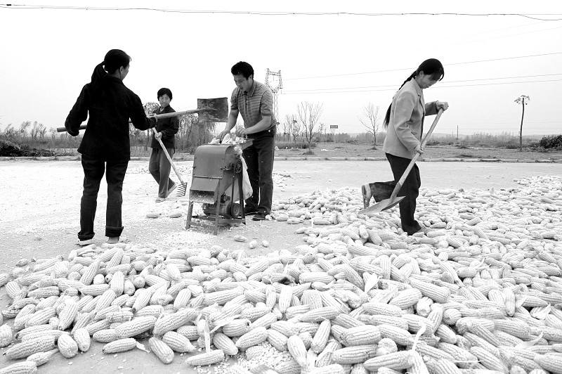 10月19日,随县厉山镇移民点勤劳村16组移民家家忙着晒玉米,为玉米脱粒。移民们在郧县老家都有种玉米的传统,迁到随县后因这里土地更加肥沃,今年亩均增收近200公斤。 (本报记者 李文军 通讯员 龚承斌摄)
