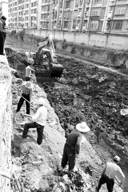10月20日,随州城区花溪河东段工人正在河底埋设排污管。花溪河东段改造工程10月中旬全面启动,该工程在对花溪河河堤进行拓宽和硬化的同时,在河底埋设直径70厘米的排污管,改造后排污和泄洪分流,可以大大改善花溪河污染情况。(本报记者 李文军 摄)