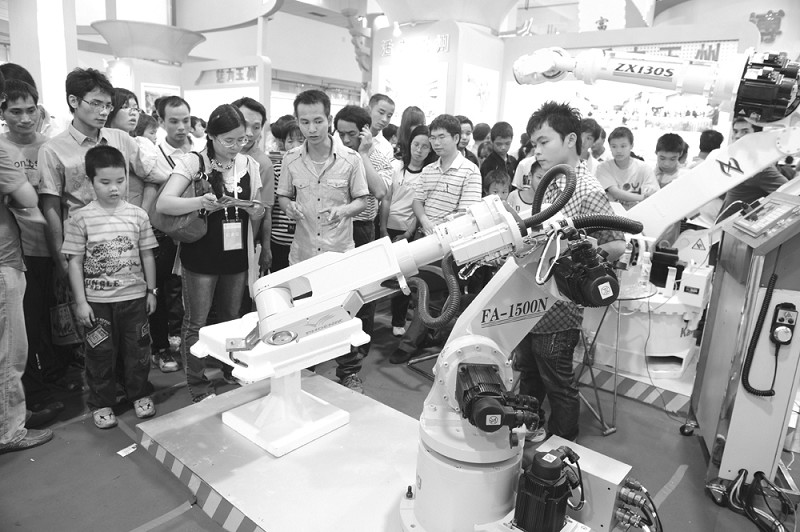 10月23日,观众在广西玉林举行的第八届中小企业商机博览会展厅参观小型工业机器人。当日,第八届中小企业商机博览会在广西玉林开幕(简称玉博会)。本届“玉博会”商品展销争奇斗艳,各项活动亮点纷呈,共吸引了27个国家、地区以及国内的25个省(市、自治区、特别行政区)的企业和客商前来参加,共设展位1300个。 (新华社发)