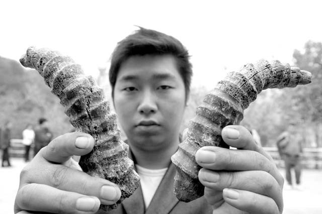 大洪山风景区长岗镇剑口龙珠山庄小伙甘林,热爱收藏景区各种奇特山石。图为他收藏的一村民在大洪山山中挖出的疑似“羊角”化石。(本报记者 杨闻名 摄)