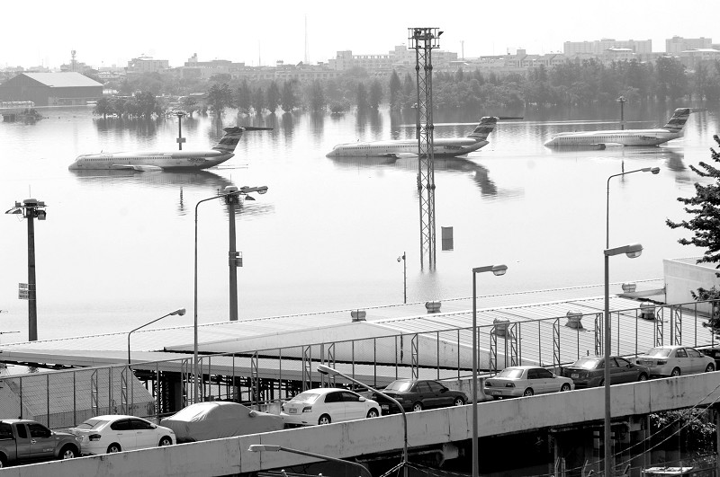 泰国7月以来强降雨引发的洪水向南消退,流入大海,经曼谷时在内城东、西、北三面受阻,迫使曼谷第二大机场廊曼机场关闭。 (新华社发)