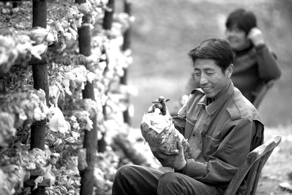 曾都区洛阳镇龚店村农民日前正在观察袋料香菇的长势,村民们说,虽然今年的袋料香菇收购价格有所下跌,但收入还算满意。 (本报记者 孙洪涛摄)