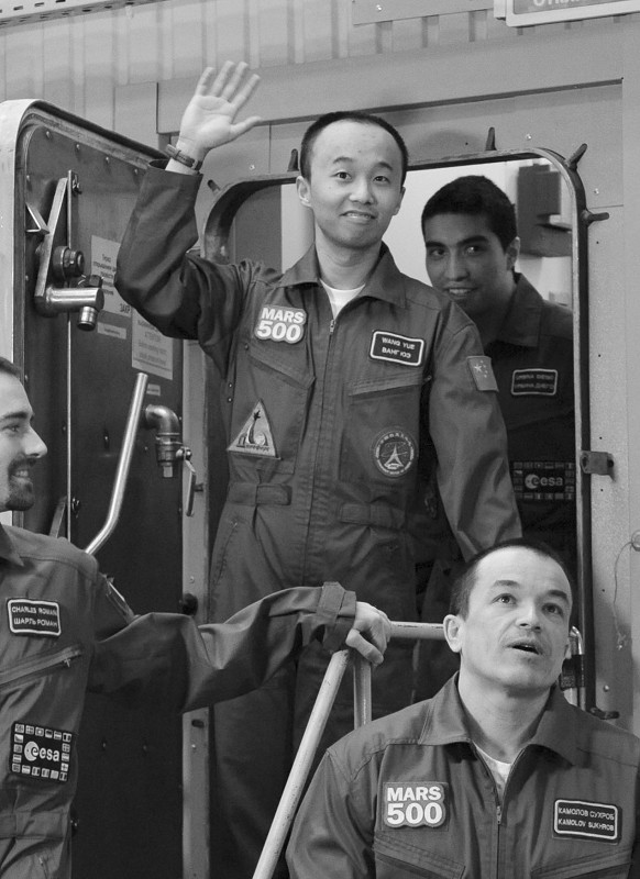 11月4日,在俄罗斯首都莫斯科,王跃(右三)和同伴一起走出实验舱后挥手。当日,中国志愿者王跃和来自其他国家的5名同伴,在莫斯科结束长达520天的往返火星与地球模拟试验,走出模拟飞船。 (新华社发)