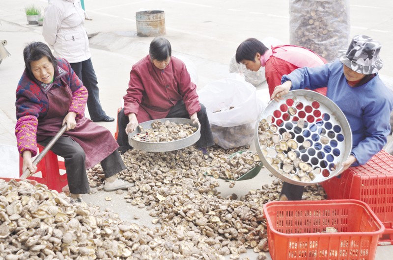 随县三里岗镇香菇大市场进入交易旺季。图为菇商对香菇进行筛选分级,以保证市场信誉。(本报记者 陈德友 摄)