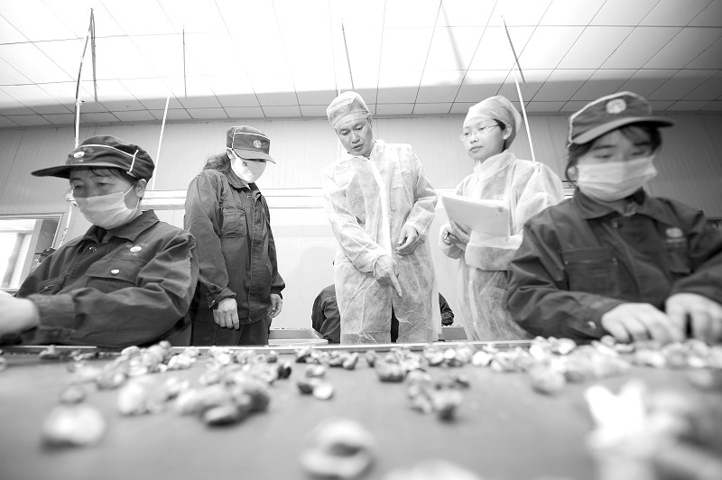 图二:10时35分,到湖北裕国菇业公司香菇深加工流水线察看企业生产情况。