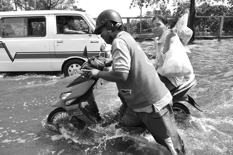 11月9日,在曼谷东部鹏昆区,一名男子在洪水中推行摩托车。泰国首都曼谷洪水形势近期依然严峻,洪水逐渐向内城逼近,不少商业区和居民区纷纷“沦陷”。 (新华社发)