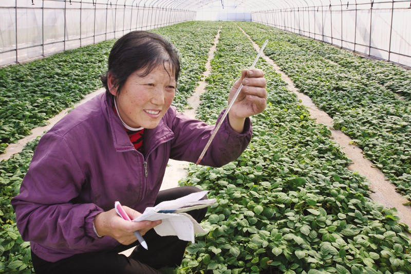 11月14日,随州市节水增效示范园凯瑞百谷马铃薯良种繁育基地,管理技术人员正在“彩薯”大棚内检查温度。该示范园主要繁育“彩薯”(紫色、黄色、红色马铃薯),培育的本土“彩薯”即将走出试验大棚,进入百姓餐桌。 (本报记者 杨闻名 摄)