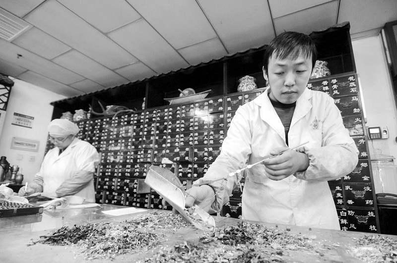 11月15日,在宁夏回族自治区银川市协力厚药店内,工作人员正在为买药的市民搭配中药材。中国中药协会中药信息中心日前发布的《2011年10月市场价格监测报告》显示,10月份中药材价格综合200指数收于2264.67点,环比9月大跌5.29%,指数下行趋势不变,短期难以反转。