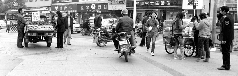 压题照片:在城区解放路一些人行道、交通路口,乱停乱放、占道经营现象有所反弹。图为拍摄于大十字街一交通路口处。(本报记者 牧野 通讯员 聂少峰 摄)