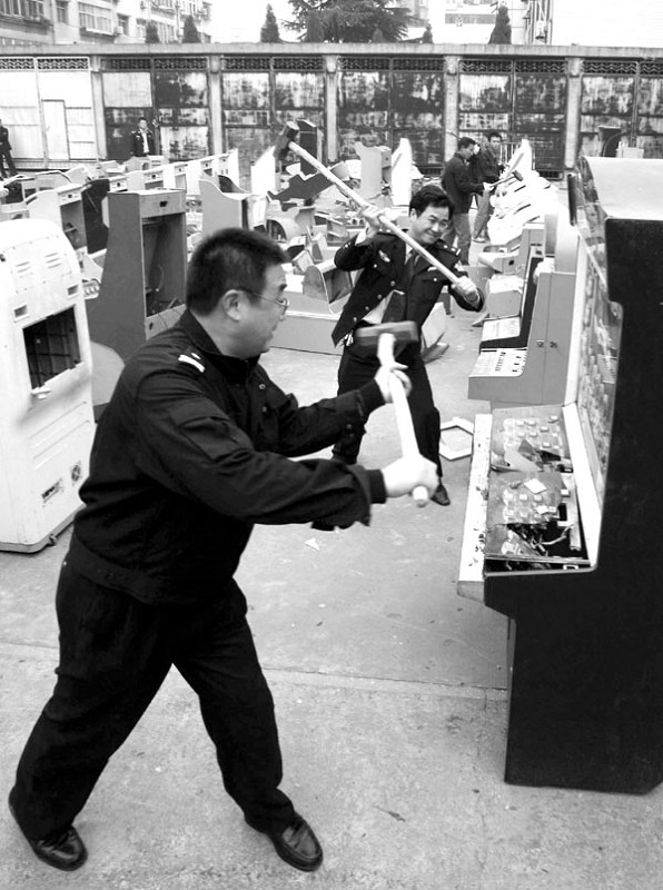 随州市公安局曾都分局日前对收缴的300多台赌博机进行公开销毁。该局还将进一步加大整治力度,净化文化市场。(本报记者 孙洪涛 摄)