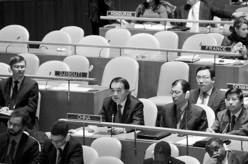 11月18日,在美国纽约联合国总部,中国常驻联合国代表李保东(二排左二)在表决后作解释性发言。他说,有关国家应继续通过对话妥善处理该问题,共同维护中东海湾地区的和平与稳定。