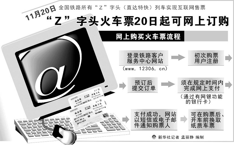 新华社11月20日电 全国铁路所有 “Z”字头(直达特快)列车20日实现互联网售票。到今年年底前,所有火车票均可实现网上订购,届时旅客将实现“足不出户”购买火车票。