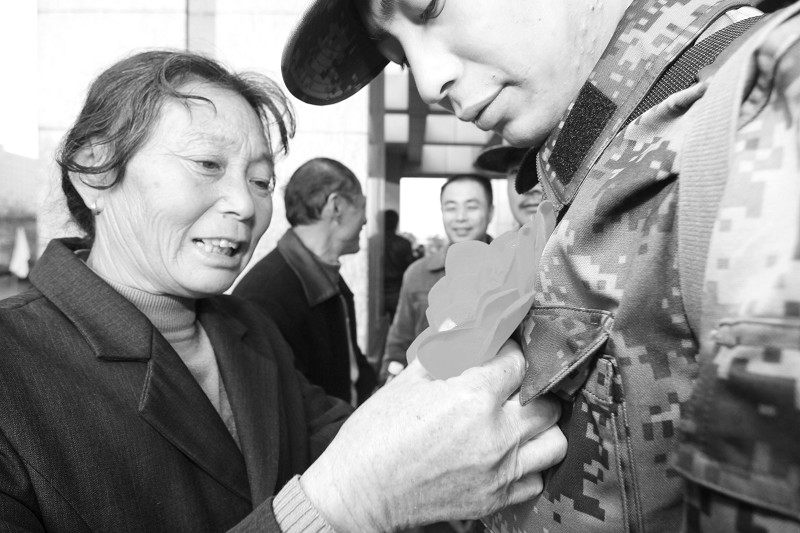 11月20日,扬州市江都区小纪镇花彭村村民姚党英为侄儿姚庆华佩戴参军大红花。近日,我国多个地区开始新兵启运工作,各地进藏新兵在家乡父老的祝福声中踏上赴藏保家卫国的征途。 (新华社发)