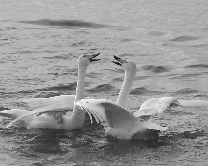 11月21日清晨,两只大天鹅在山东荣成大天鹅自然保护区湖面上“对歌”。