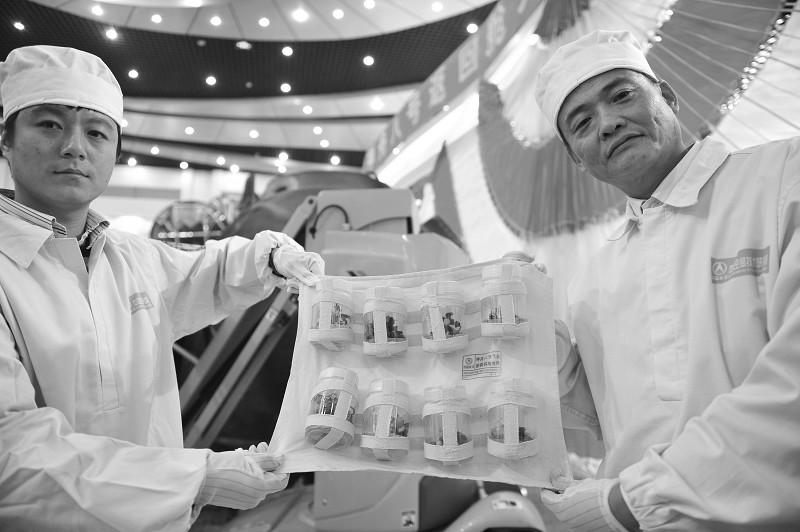 图为:11月21日,工作人员展示从神州八号返回舱中取出的番茄试管苗空间开花结实实验装置。 (新华社发)
