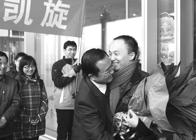 12月6日,参与“火星-500”实验的中国志愿者王跃(右)受到同事和亲友的热情欢迎。当日,王跃历经520天密闭实验后,从俄罗斯乘机回到北京。“火星-500”实验是俄罗斯组织的、多国参与的国际大型实验。2010年6月3日,包括王跃在内的6名志愿者进入密封船舱,模拟从飞船发射、飞向火星、登陆火星到返回地球的全过程,并于2011年11月4日顺利出舱。 (新华社发)
