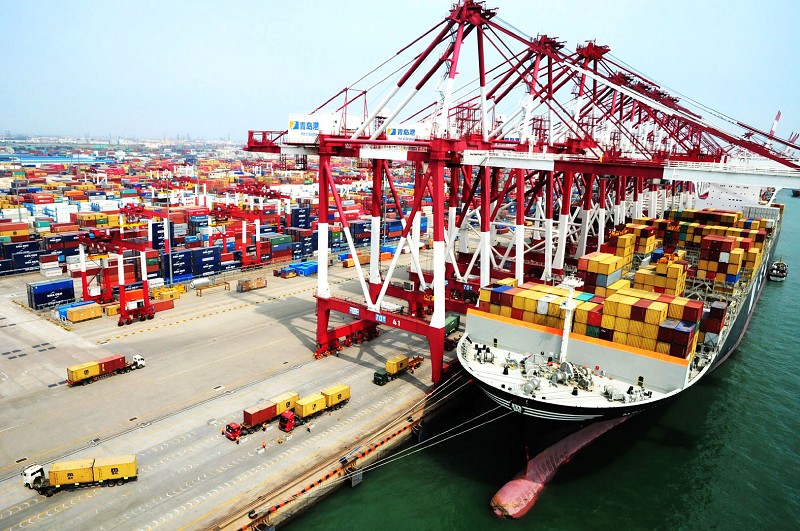 国务院新闻办公室12月7日发布的《中国的对外贸易》白皮书指出,中国连续两年成为世界货物贸易第一出口大国和第二进口大国。图为德国籍集装箱轮“地中海·利沃尔诺”号停靠在山东青岛港前湾集装箱码头。 (新华社发)