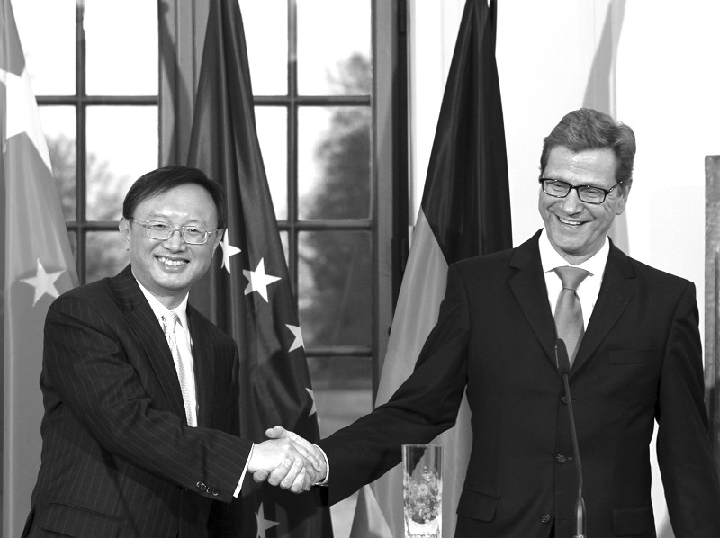 12月7日,在德国柏林,中国外交部长杨洁篪(左)与德国外长韦斯特韦勒举行第二轮中德外长级战略对话后出席新闻发布会。 (新华社发)