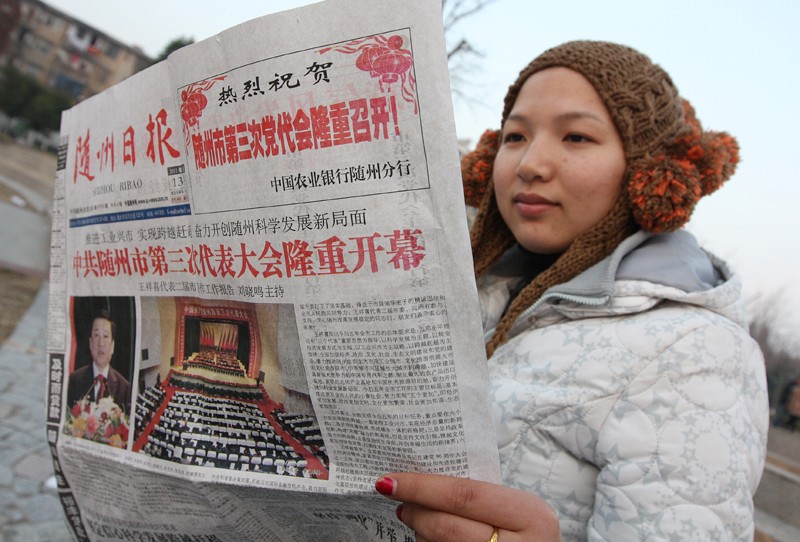 昨日,在城区神农公园,一市民正在阅读《随州日报》关于市第三次党代会的报道。