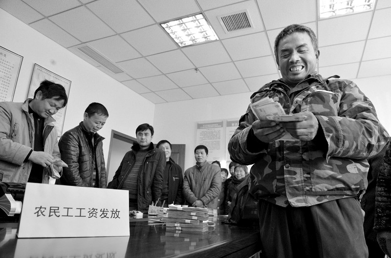 12月16日,安徽省合肥市蜀山经济开发区管委会内,农民工李云(右一)拿到了自己的工资。12月16日起,安徽省合肥市蜀山经济开发区一工地内的近八百位农民工在当地政府的协调、维权之下,将在本周内陆续拿到拖欠了3个多月的工资。据介绍,两千万的欠薪是近八百位农民们辛苦工作半年甚至一年的工资,本该在今年9月发放,但农民工们却迟迟拿不到手。 (新华社发)