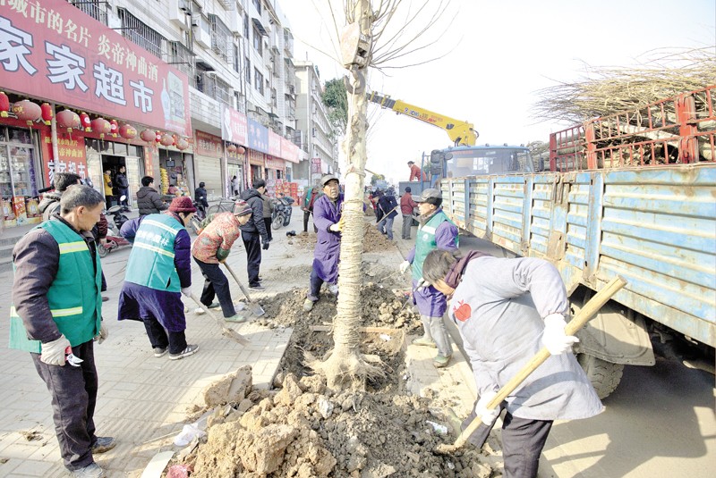 十二月十七日,园林工人正在随城青年路东段栽植大规格的法桐和樟树。我市将投资近六百万元同步推进青年路东段和花溪河东段改造绿化配套,将栽植五百余株道旁树和建设亲水平台,此举可新增绿化面积三万平方米。(本报记者 李文军/摄 通讯员 刘红元/文)