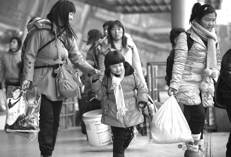 1月3日,在南京火车站候车室外,小朋友跟随家长准备乘车返乡。随着春节临近,跟随父母在异乡生活的孩子们像候鸟一般,开始陆续返回故乡。虽然路途辛苦,但有了父母的陪伴,归乡路上也就多了一分幸福。 (新华社发)