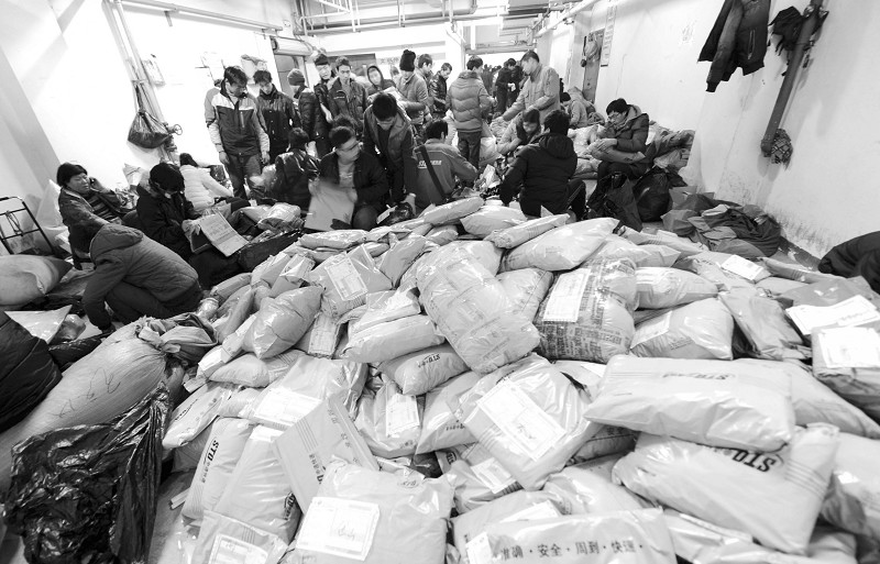 1月10日,众多网店店主在杭州网店密集的四季星座大厦地下车库内交寄快件。