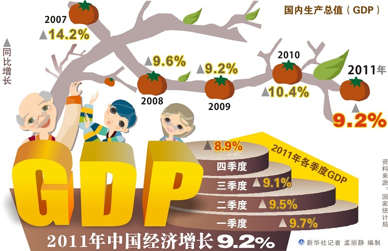 国家统计局初步测算显示,2011年中国经济比上年增长了9.2%。其中一季度增速为9.7%,二季度9.5%,三季度9.1%、四季度8.9%。