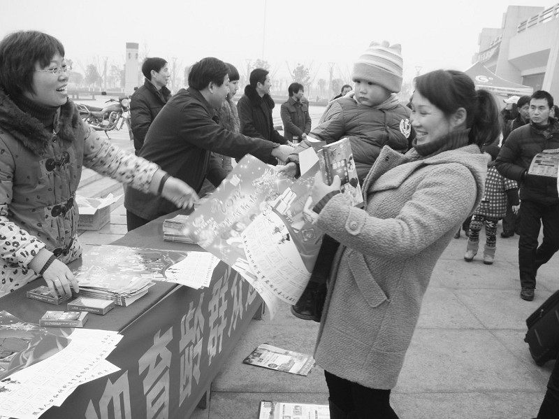 春节前,市计生委会同曾都、随县、随州经济开发区计生部门到随州火车站开展宣传活动,向返乡的育龄群众宣传计划生育政策,发放计生用品和印有计划生育知识的年历。 (本报记者 徐 斌 通讯员 向以涛 摄)