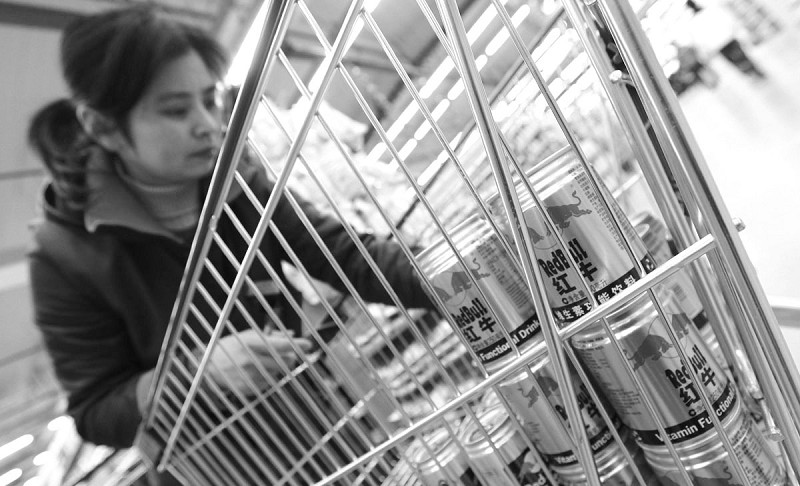 2月11日,上海一家大型超市的工作人员正在将“红牛”饮料下架。针对部分媒体报道“红牛”功能饮料涉嫌违规添加食品添加剂等问题,上海部分超市已主动下架相关产品,监管部门表示正密切关注事件发展。 (新华社发)