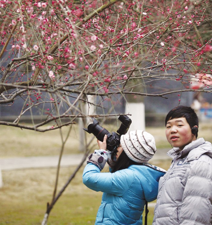 随州市白云公园红梅日前竞相开放,引得众多游人在梅园拍照留念。(本报记者 孙洪涛 摄)