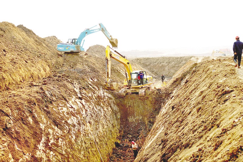 2月13日,季梁公园总面积320亩的人工湖疏通渠正在施工中。该公园是我市2012年重点市政工程,目前人工湖挖湖、人工山体堆造、道路骨架等主体工程已经完工,预计整个工程今年年底前基本完工并免费向市民开放。(本报记者 李文军 摄)
