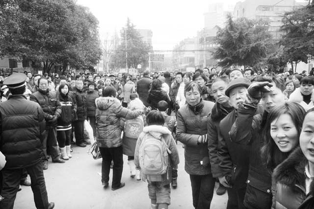 学校门前接送孩子的家长把校门口堵得严严实实,孩子们从缝隙中穿行。近日,记者在随城一所小学门前拍摄这一镜头。有关人士建议,给孩子们留条通道,让他们平安快速回家。 (本报记者 杨闻名 摄)
