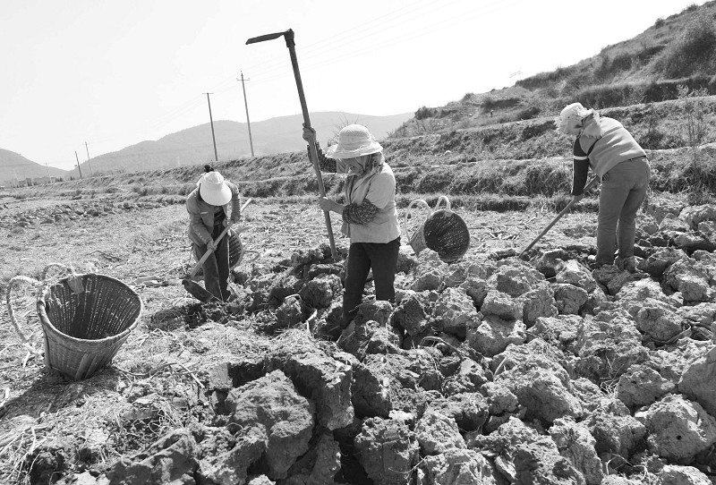 这是云南省马龙县月望乡大海子村的几名农妇在给耕地松土,准备开始春耕生产。为抗御云南的 “三年连旱”,2012年以来,云南累计投入抗旱资金17980万元,发动 195万 人(次)投入抗旱救灾。已临时解决315.4万人、155万头大牲畜饮水困难,实现抗旱浇灌面积296万亩。