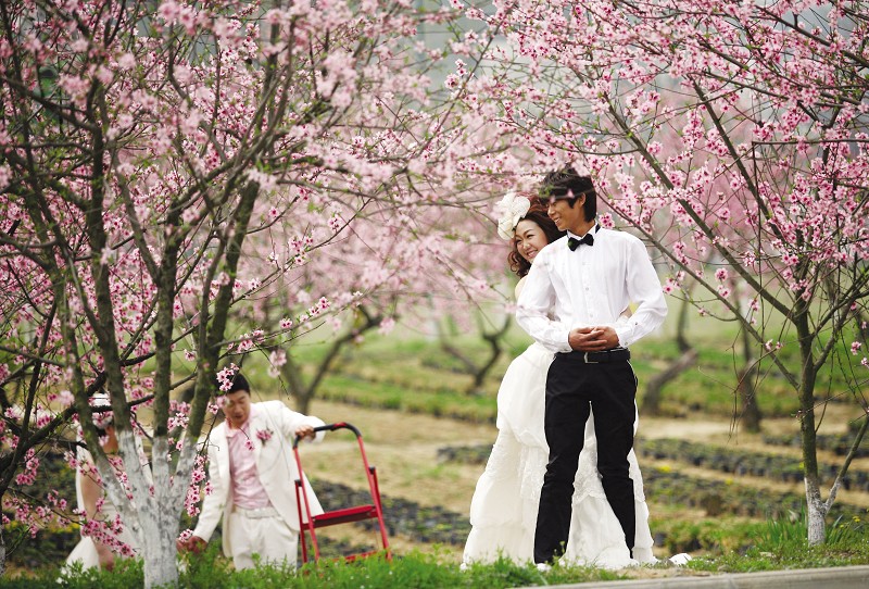 4月2日,随城一湖两岸风光带里桃红柳绿,吸引了一对对新人在这里拍照留念。 (本报记者 孙洪涛摄)