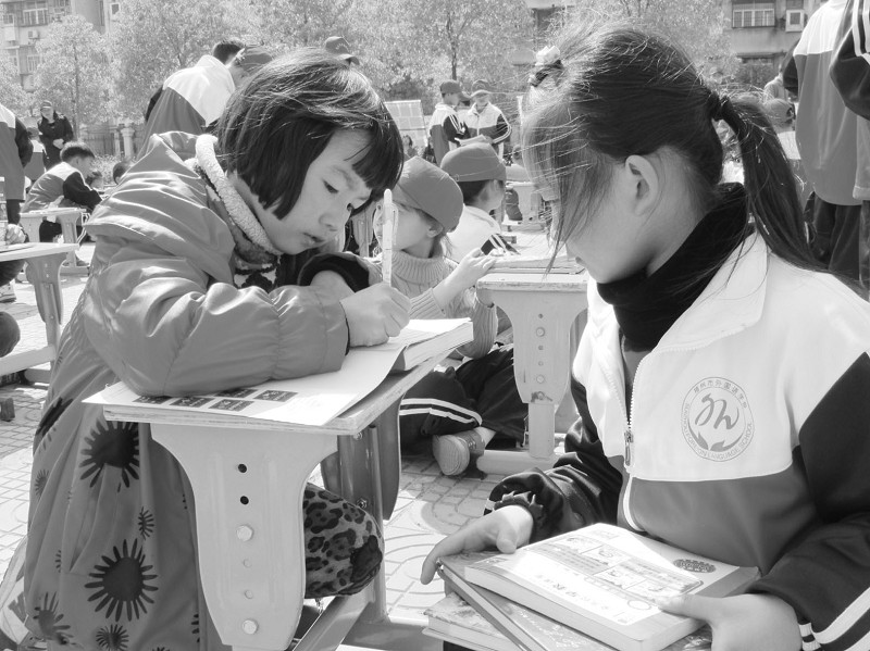 低碳阅读,快乐换书。四月一日,随州市外国语学校小学部在学校操场开展“低碳环保换书”活动。学生们分享读书心得,互相填读书卡片,不仅读到自己心仪的课外书,还结识了不少新朋友。(本报记者陈巧玲通讯员刘考申摄)