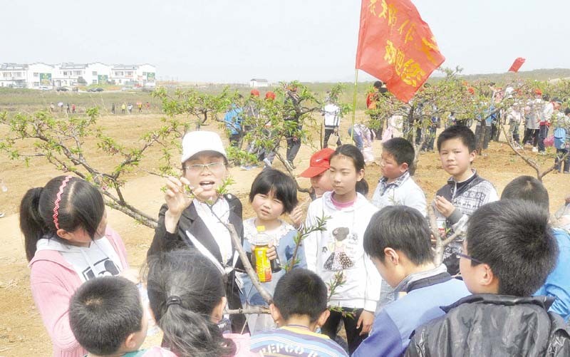 4月8日,随县尚市桃花园景区,前来春游的学生在老师带领下观察桃花生长过程。(本报记者 杨闻名 摄)