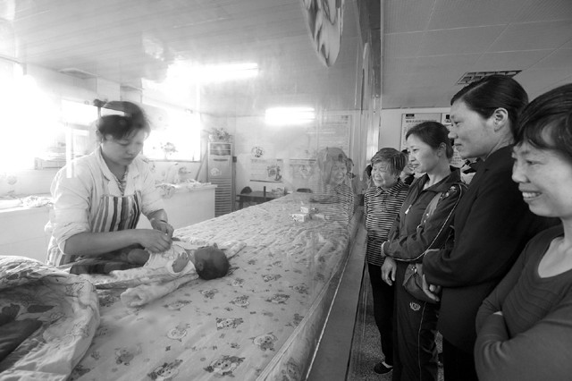 4月10日,“月嫂”们在市妇幼保健院实习时,学习医护人员为新生儿洗浴等护理方法。