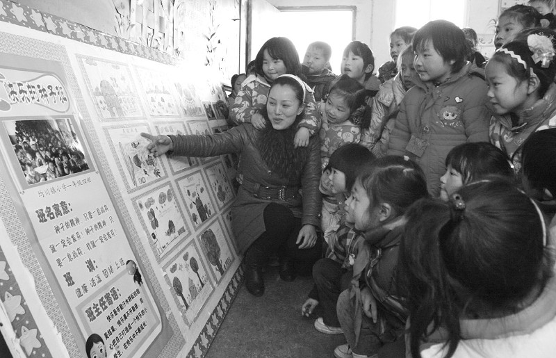 快乐种子,播进儿童的心田。随县均川镇小学在特色班的建设中,给学生搭建一个展示自我、张扬个性的平台,促进学生身心健康地成长。图为该校“快乐种子班”的师生在一起欣赏学生们的绘画作品。 (本报记者 张顺 通讯员刘海生 摄)