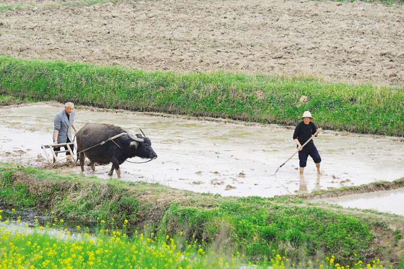 图二:4月15日,记者在随县农村采访看到农民纷纷在农田忙春耕、植棉苗。图为尚市镇农民正在灌水整理秧田。(本报记者 李文军 摄)