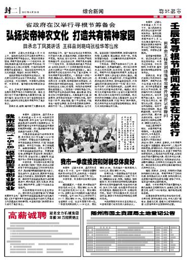 本报讯 记者毛传荣报道:4月19日上午,省政府在武汉召开壬辰年世界华人炎帝故里寻根节筹备会议。副省长田承忠强调,寻根节是我省唯一一个经党中央、国务院批准的重大祭祀活动和节庆活动,对构建社